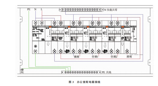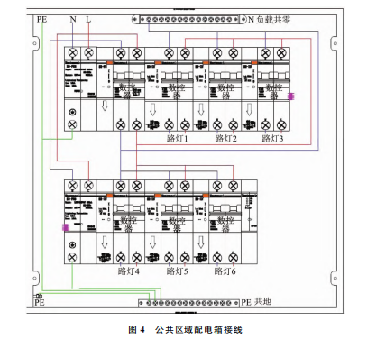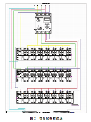 智慧用電監管平臺設置每個宿舍由一個空氣開關控制,配電箱接線如圖2所示。每個公室由一個空氣開關控制,配電箱接線如圖3所示。每個公共區域照明燈由一個空氣開關控制,配電箱接線如圖4所示。可分別對各回路電流、功率進行設定,當回路電流或功率超過限定值時,該回路自動跳閘保護。自由設定宿舍空調、照明及插座等每個回路的開啟和關閉時間,通過手機遠程管理,同時可以按鍵自動控制,也可以通過手動推桿控制通斷電。一旦發現險情,立即預警,并發送預警信息至手機應用程序及微機端。通過告警功能、預警機制,及時發現配電系統設備、周圍環境的異常情況,以便及時進行檢查與維護,防止意外事故發生。