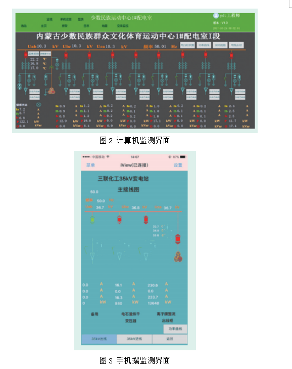 通信管理機從用戶二次系統中讀取數據,無線溫度監測儀測量電纜3相電流。將數據傳輸到可編程控制器模塊,可編程控制器對接收到的電壓、電 流、頻率等非開關量和開關量數據進行處理,通過GPRS模塊將數據傳輸到阿里云,PC端(如圖2)和手機端(如圖3)可通過相應軟件從阿里云服務器中獲取相關數據,對用戶系統狀態進行監視。