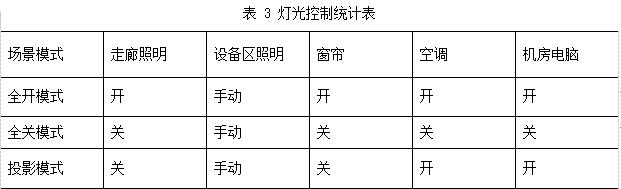 場景控制:分四類場景,全開模式打開機房所有燈光、空調和插座開關;全關模式關閉所有燈光、空調和插座開關;投影模式關閉窗簾和部分燈光回路,保證投影清晰顯示;清潔模式打開窗簾和部分燈光回路,保證基本照明。具體如表3 所示。
