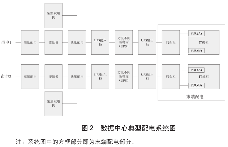 數(shù)據(jù)中心要實現(xiàn)持續(xù)穩(wěn)定運行,前提是其供電系統(tǒng)應(yīng)穩(wěn)定可靠、不間斷。當(dāng)前,重要程度高的A級數(shù)據(jù)中心一般采用2N架構(gòu)的UPS供電方式,以實現(xiàn)容錯要求,供電系統(tǒng)包括高低壓配電、后備發(fā)電機(jī)組、不間斷電源、后備蓄電池、精密配電等子系統(tǒng),典型的數(shù)據(jù)中心供電系統(tǒng)如圖1所示。
