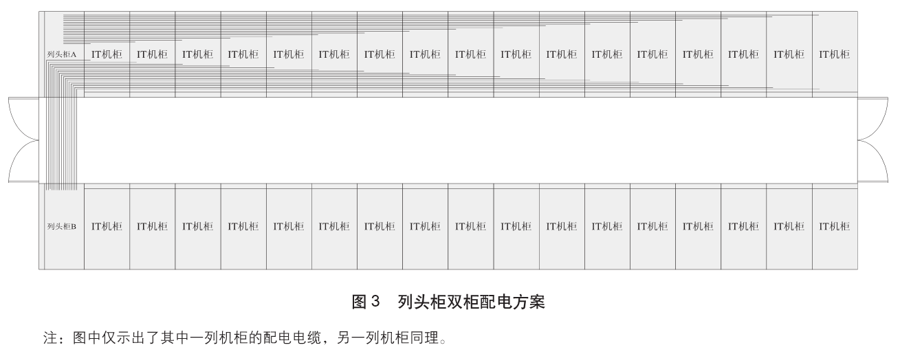 IT機(jī)柜的供電方式為:每個IT機(jī)柜內(nèi)包括兩路PDU,PDU(A) 和PDU(B),其中PDU(A)通過電纜由列頭柜A取電,PDU(B)通過電纜由列頭柜B取電。