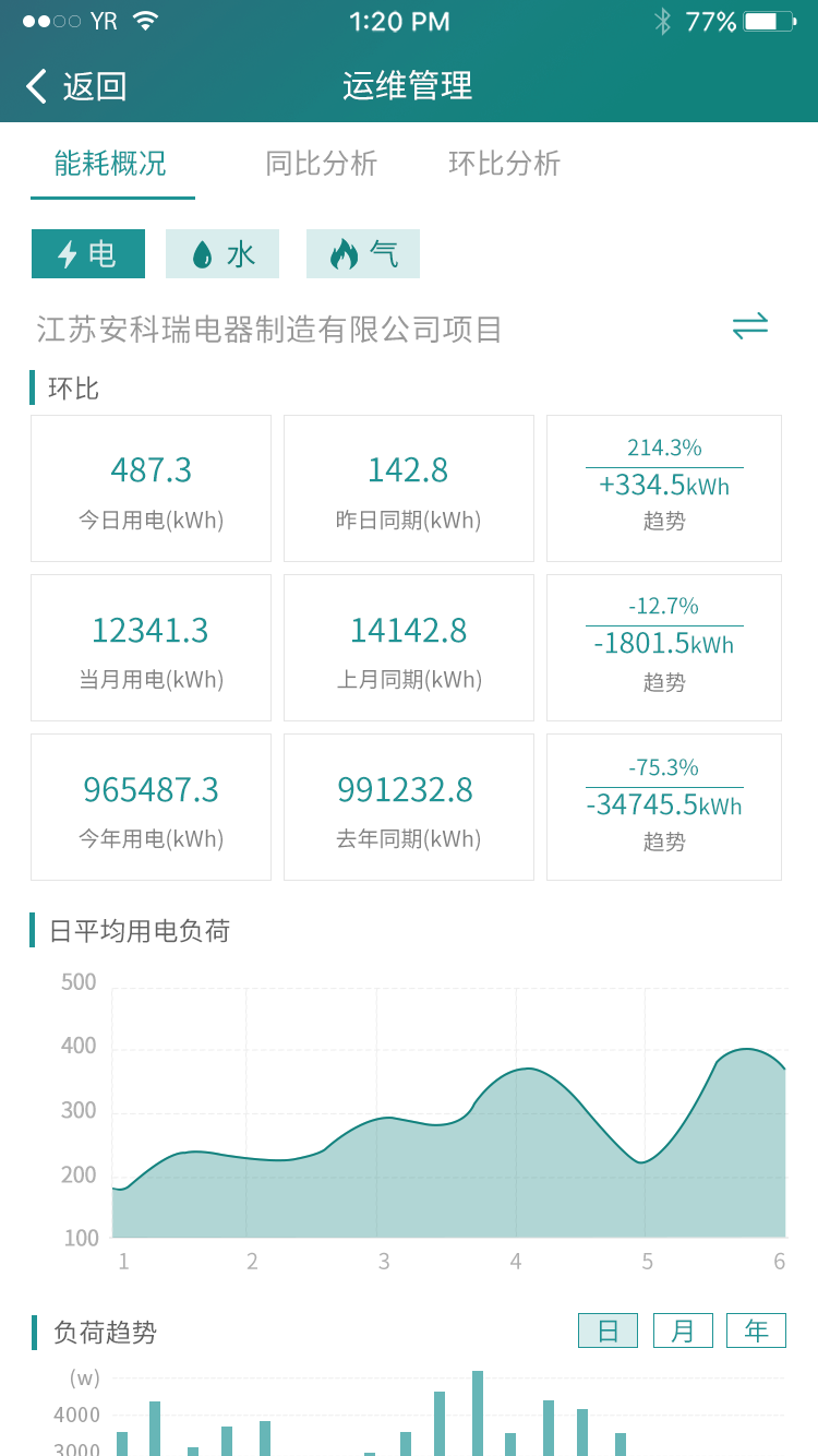 針對智慧用電部分,系統提供能耗分析功能,按回路可查詢日月年的能耗報表和曲線。