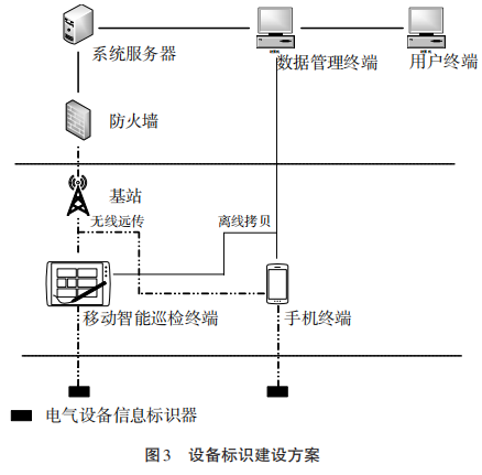 閱讀器兼容各頻段的電子信息標識器,當電子信息標識器進入閱讀器發射的射頻場后,其憑借感應電流所獲得的能量發送出存儲在電子信息標識器內部的電網設備相關信息。由于RFID技術具備穿透性,所以閱讀器可實現對電子信息標識器的穿透讀取。閱讀器可采用移動智能巡檢終端或者帶有NFC(Near Field Communication)近場通信功能的手機等形式[3]。設備標識建設方案如圖3所示。