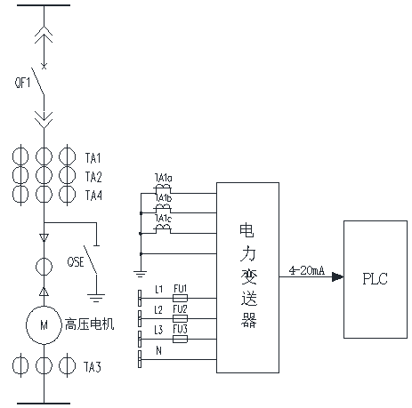 磨漿機10kV高壓系統電路圖如圖2所示。功率變送器通過裝在磨漿機10kV高壓電機線路中的電壓互感器和電流互感器,采集電壓和電流,從而檢測磨漿機10kV高壓電機的功率,功率變送器以4mA表示功率信號的零點,用20mA表示功率信號的滿刻度,然后將功率信號以DC4-20mA成比例關系線性輸出,傳至PLC。PLC根據功率信號動態地調節磨漿機的刀距,控制進刀或退刀,從而實現恒功率打漿控制。
