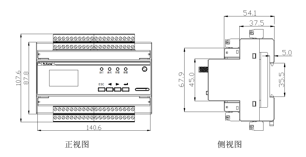 (2)剩余電流監測儀外形與安裝尺寸如下圖所示。(單位:mm)