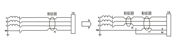 對于TN-C系統,不能采用剩余電流繼電器。因為 PE 線和 N 線合一,若 PEN 線不重復接地,當外殼帶電,互感器進出電流相等,ASJ拒動;若PEN線重復接地,部分單相電流將流入重復接地,達一定值后,ASJ 誤動。 需將TN-C系統改造成TN-C-S系統,同TN-S系統,再將剩余電流互感器接入TN-S系統中。
