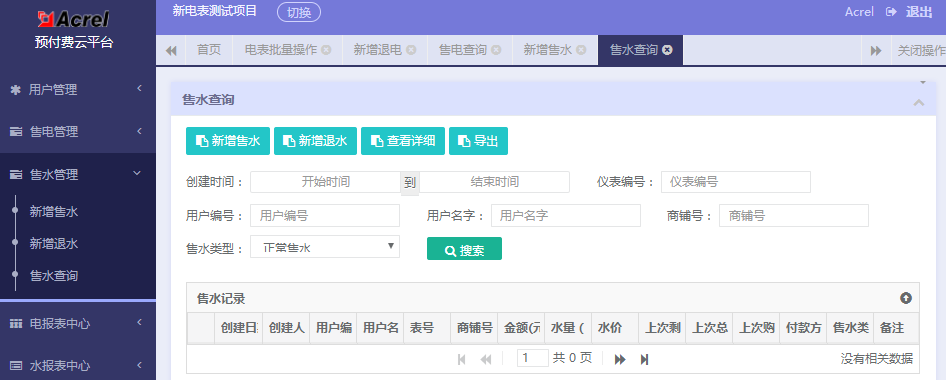 系統提供了新增售水、充正、退電,明細及分類查詢。