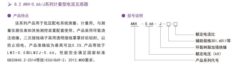 AKH-0.66 J系列計量型電流互感器產品用于低壓配電系統測量、計量用,與測量儀器儀表和其他測控裝置配套使用,產品采用環氧澆注絕緣,二次接線端子采用透明接線罩罩好后鉛封,以防止竊電,產品準確級為最高可達0.2S產品等效于LMZ-0.5和LMZJ-0.66,性能滿足國家標準GB20840.2-2014(等效IEC61869-2:2012MOD)要求。