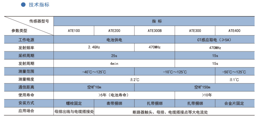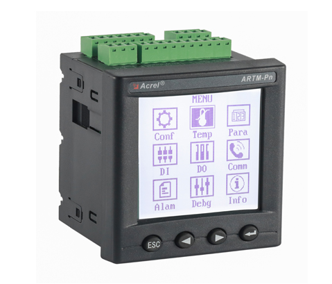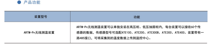 ARTM-Pn無線測溫裝置:ARTM-Pn無線測溫裝置可以單獨安裝在高壓柜、低壓抽屜柜內,每臺裝置可以接收18個傳感器的數據,傳感器型號可選配ATE100、ATE200、ATE300。裝置帶有一路485接口,可將采集到的溫度數據上傳到監控中心。