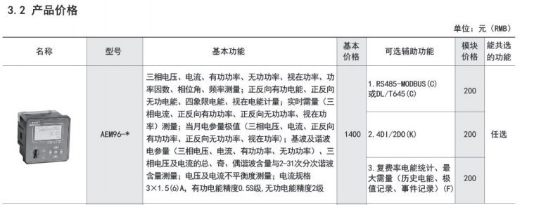 AEM 三相嵌入式多功能電能表,是主要針對(duì)電力系統(tǒng),工礦企業(yè),共用設(shè)施的電能統(tǒng) 計(jì)、管理需求而設(shè)計(jì)的一款智能儀表,產(chǎn)品具有精度高、體積小、安裝方便等優(yōu)點(diǎn)。集成全 部電力參數(shù)測(cè)量及全面的電能計(jì)量及考核管理,提供上 24 時(shí)、上 31 日以及上 12 月的各類(lèi) 電能數(shù)據(jù)統(tǒng)計(jì)。具有 31 次分次諧波與總諧波含量檢測(cè),帶有開(kāi)關(guān)量輸入和繼電器輸出可實(shí) 現(xiàn)“遙信”和“遙控”功能,并具備報(bào)警輸出。帶有 RS485 通信接口,可選用 MODBUS‐RTU 或 DL/T645‐2007 協(xié)議。本系列包括 96 型、42 型兩種規(guī)格,其中 42 型還具有零線電流測(cè)量 功能。該電力儀表可廣泛應(yīng)用于各種控制系統(tǒng),SCADA 系統(tǒng)和能源管理系統(tǒng)中。