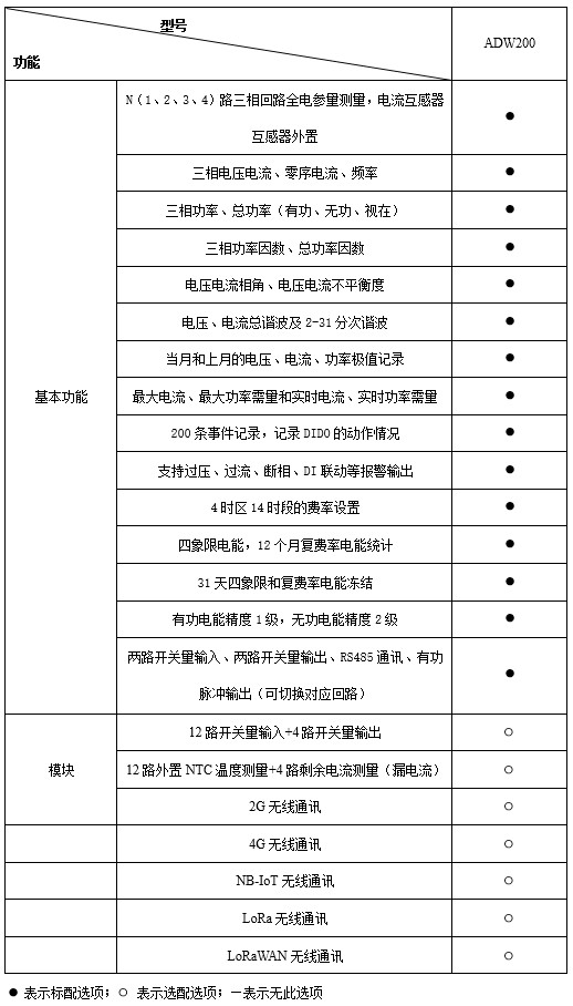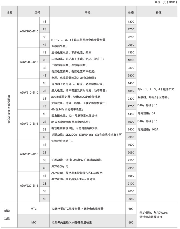 ADW2xx系列導軌式多回路無線計量表主要用于低壓三相回路全電參量測量,同時可選擇四個回路的電流輸入。可直接或間接測量電壓、電流、功率、功率因數、相角、不平衡度、諧波等參數。 還可通過其RJ45接口擴展輔助功能,實現DI、DO、測溫、剩余電流測量,以及2G、4G、LoRa、LoRaWan、NB-Lot無線通信功能。