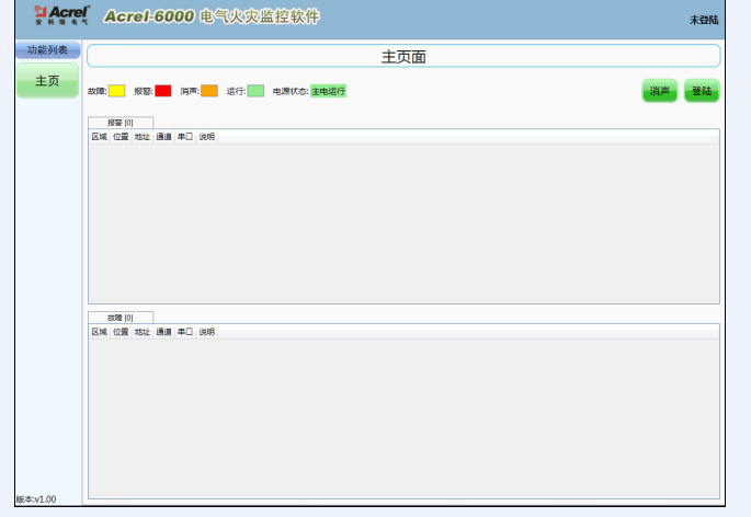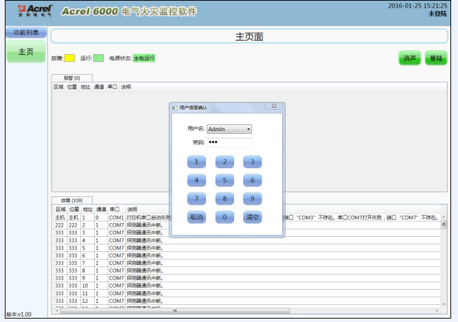 包含“登陸”、“消音”、“運(yùn)行監(jiān)視界面” 及“系統(tǒng)狀態(tài)欄”四部分,可以分別通過點(diǎn)擊系統(tǒng)主界面上方的菜單欄或快速啟動欄內(nèi)按鈕進(jìn)入各相關(guān)功能界面。