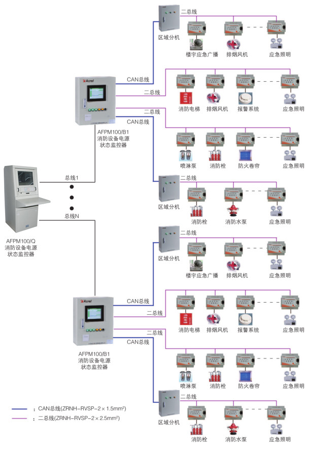 AFPM100消防設(shè)備電源監(jiān)控系統(tǒng)采用AFPM100/Q消防設(shè)備電源狀態(tài)監(jiān)控器(主機(jī))+AFPM100/B1消防設(shè)備電源狀態(tài)監(jiān)控器(分機(jī))+區(qū)域分機(jī)+電壓電流傳感器四層結(jié)構(gòu)組網(wǎng)模式,適用范圍廣,滿足各種環(huán)境的現(xiàn)場(chǎng),便于區(qū)域化管理,傳感器與監(jiān)控器之間采用二總線通訊,監(jiān)控器與分機(jī)之間采用CAN總線通訊,滿足了通訊實(shí)時(shí)性高的要求。