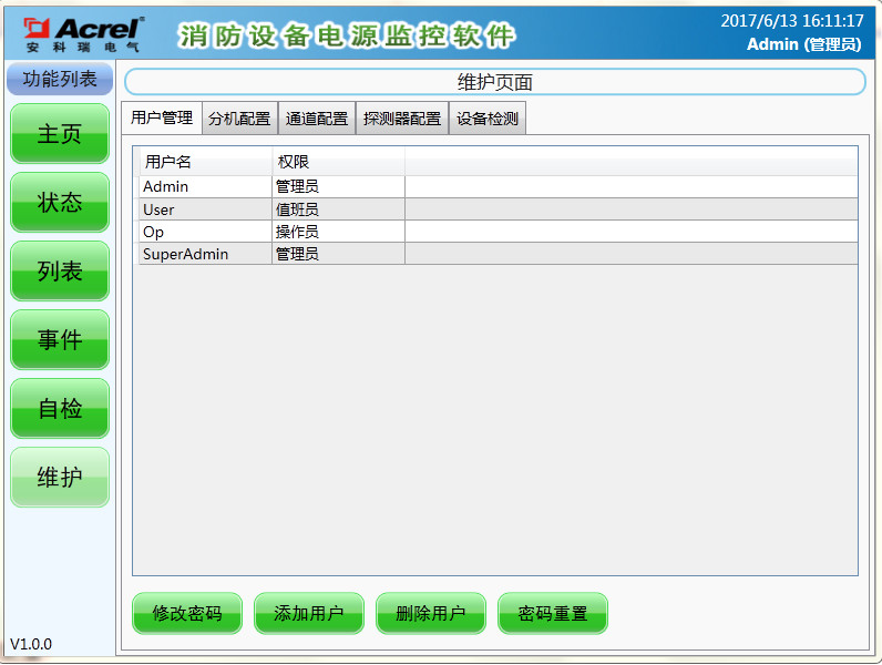 該界面可添加新的“操作員”和“值班員”權(quán)限的新用戶,也可刪除這兩個(gè)級(jí)別的現(xiàn)有用戶,該管理功能只有“超級(jí)管理員”和“管理員”可進(jìn)行操作。