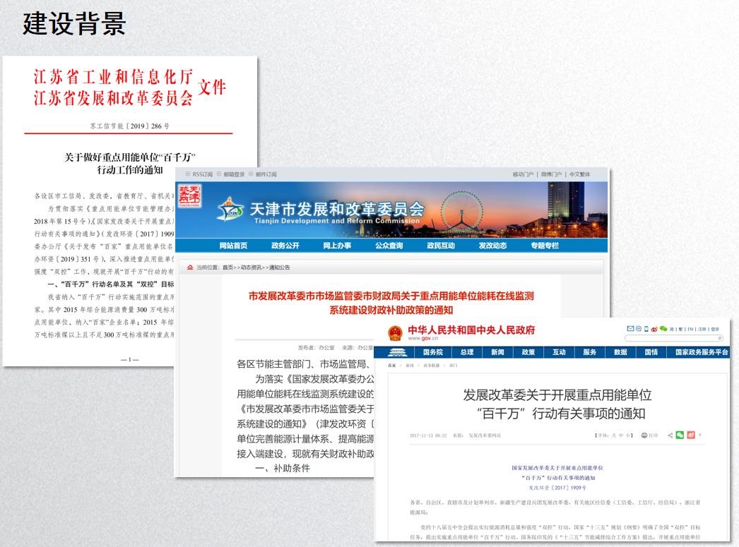 為貫徹落實《重點用能單位節能管理辦法》(國家發改委2018年第15號令)、《國家發改委關于開展重點用能單位“百千萬”行動有關事項的通知》(發改環資〔2017〕1909號)和國家發改委辦公廳《關于發布“百家”重點用能單位名單的通知》(發改辦環資〔2019〕351號),深入推進重點用能單位能源消耗總量和強度“雙控”工作,各省市相關主管部門陸續發出通知,要求納入“百千萬”行動的重點用能單位落實節能主體責任,加強節能管理,并按照《重點用能單位能耗在線監測系統推廣建設工作方案》(發改環資〔2017〕1711 號)等要求,建設接入端系統并按時接入省級重點用能單位能耗在線監測平臺,對未按要求開展重點用能單位能耗在線監測系統建設、未配備和使用能源計量器具的,依法依規責令限期整改,逾期不整改或整改未達到要求的,嚴格按照有關法律法規進行處罰。