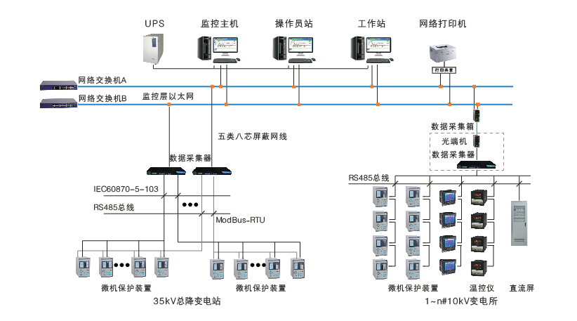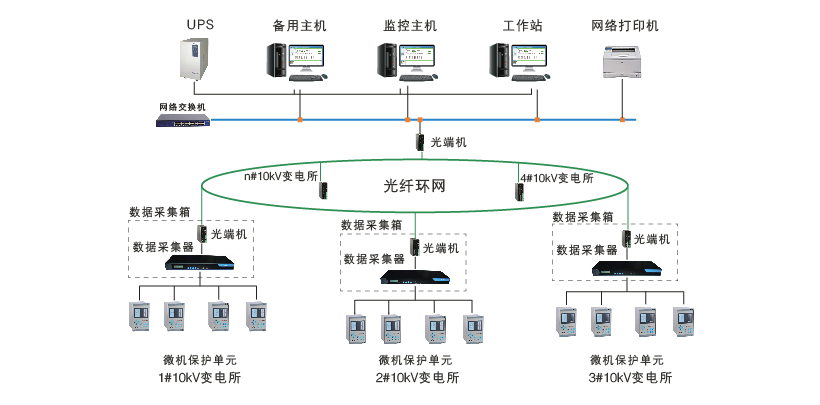 智能配電監(jiān)控系統(tǒng)組網(wǎng)方式靈活,支持星型單機(jī)單網(wǎng)、星型雙機(jī)雙網(wǎng)、光纖環(huán)網(wǎng)。星型單機(jī)單網(wǎng)適用于系統(tǒng)設(shè)備數(shù)少、規(guī)模小,值班室或監(jiān)控中心距離高低壓室比較近,可靠性要求一般的項(xiàng)目;環(huán)型光纖雙機(jī)單網(wǎng)適合可靠性要求較高、分站之間要求相互影響較小、可擴(kuò)展性要求一般的項(xiàng)目;星型光纖雙機(jī)雙網(wǎng)適合可靠性要求很高、分站之間要求相互影響小、可擴(kuò)展性要求很高的項(xiàng)目。