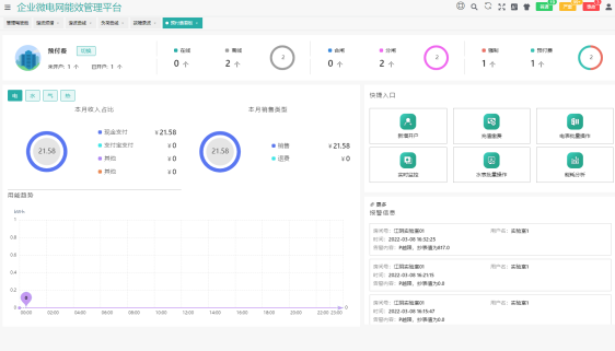 為平臺主界面,針對于企業微電網的源、網、荷、儲、充的各個關鍵節點安裝監測、分析、保護、治理裝置, 通過高性能邊緣計算網關采集數據并上傳至企業微網平臺。平臺根據新的電網價格、用電負荷、電網調度指令等情況, 調整各系統控制策略并遠程下發,使企業微電網始終高效穩定運行,降低企業用電成本,實現能源互聯、信息互動。