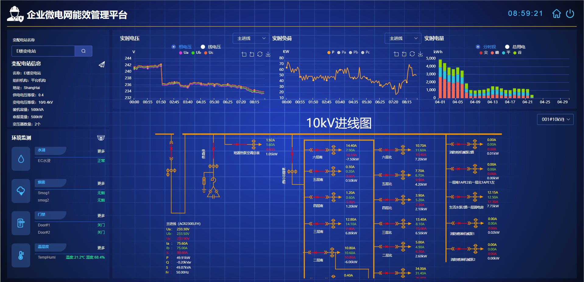 平臺可實時監測變電所內變壓器、各配電回路的運行情況,并記錄各電力參數的歷史數據。