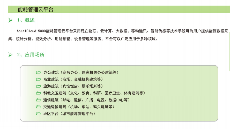 AcrelCloud-5000能耗管理云平臺采用泛在物聯、云計算、大數據、移動通訊、智能傳感等技術手段可為用戶提供能源數據采集、統計分析、能效分析、用能預警、設備管理等服務,平臺可以廣泛應用于多種領域